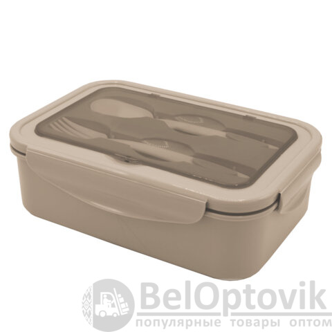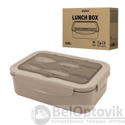 Ланч-бокс контейнер 2 секции 3+1 отделение 1,4л ложка, вилка 7х21х14см, бежевый JOYLUX, 609349