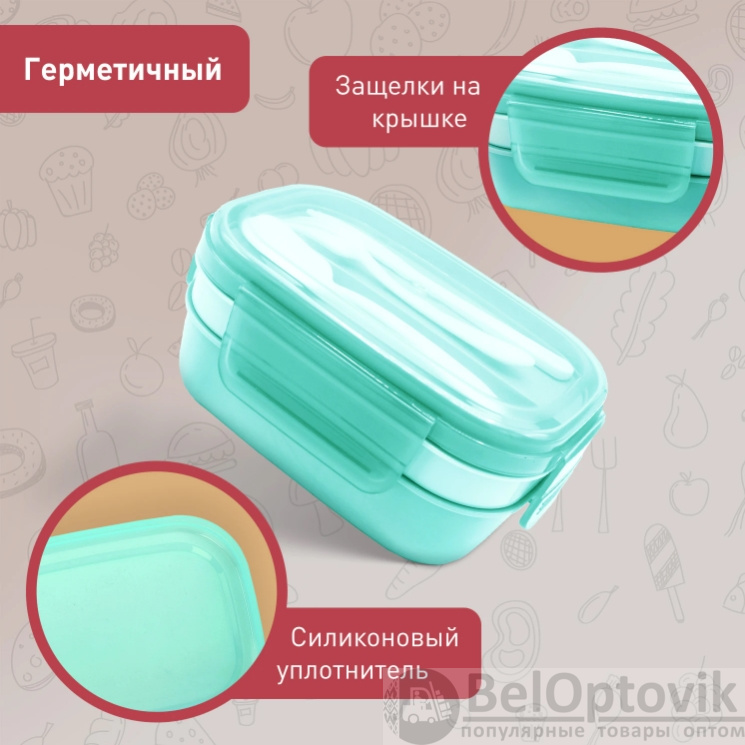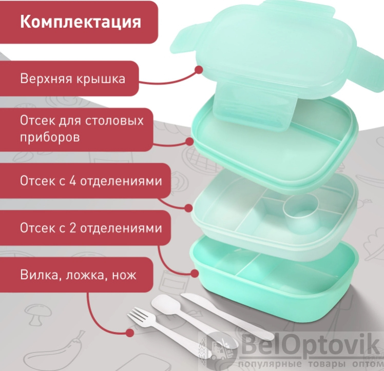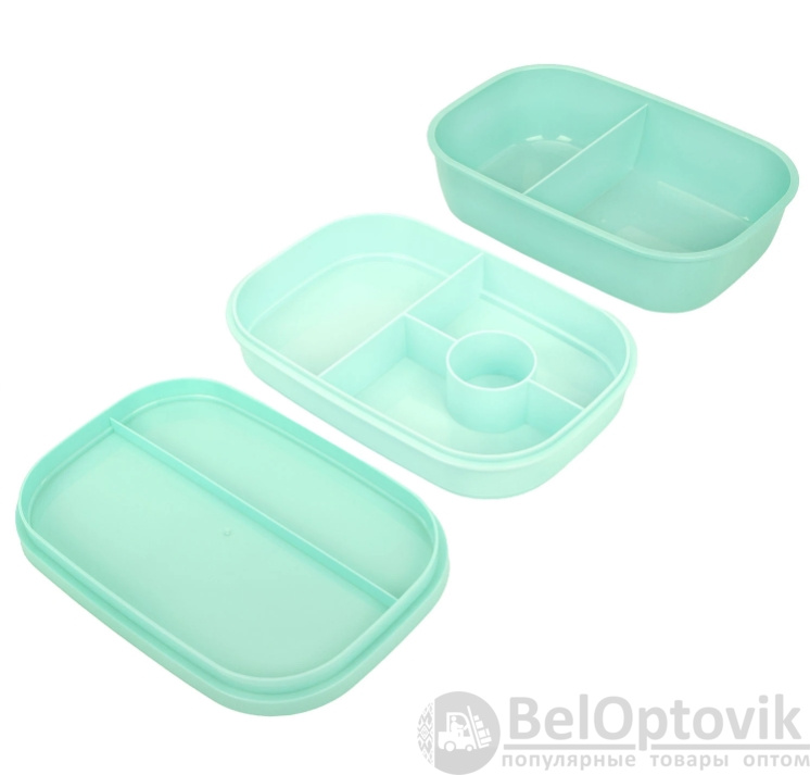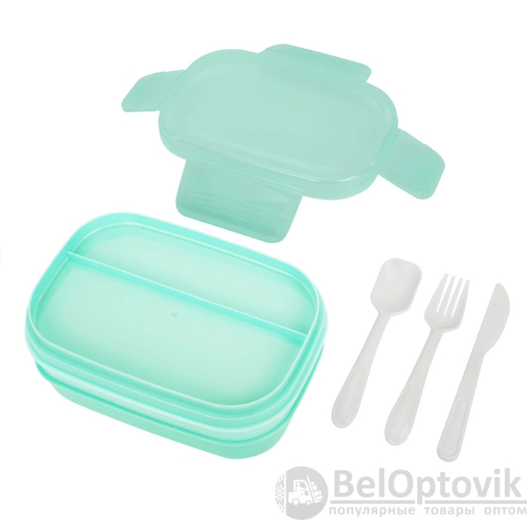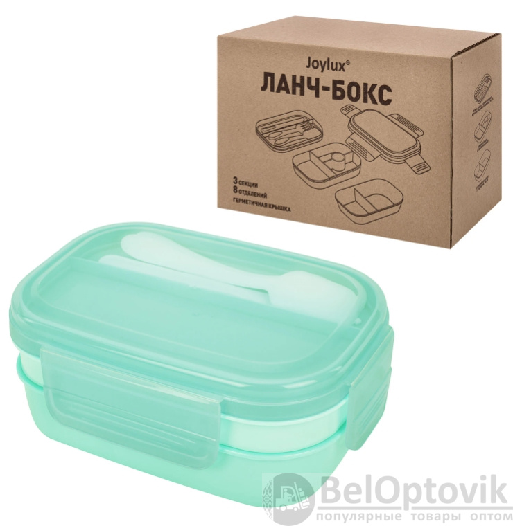 Ланч-бокс контейнер 3 секции 8 отделений 1,9л ложка, вилка, нож 10х21х14см мятный JOYLUX, 609350