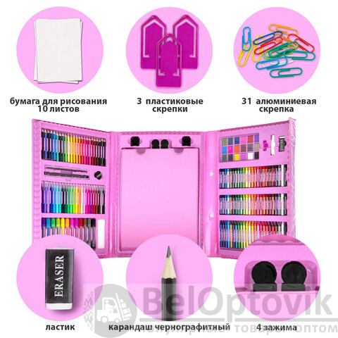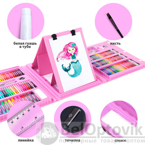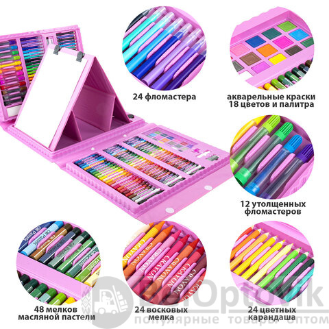 В набор входят: удобные мини-фломастеры -24 цвета; качественные цветные карандаши -24 цвета; акварельные краски - 18 цветов; яркие восковые мелки - 24 цвета; масляная пастель насыщенных цветов - 48 штук; утолщенные фломастеры - 12 цветов; пластиковые скрепки для бумаги - 3 штуки; зажимы для бумаги - 4 штуки; пластиковая палитра для рисования -1 штука; кисть из синтетики -1 штука; чернографитный карандаш - 1 штука; ластик -1 штука; точилка -1 штука; белая гуашевая краска в тубе -1 штука; спонж для рисования - 1 штука; цветные алюминиевые скрепки - 31 штука; пластиковая линейка - 1 штука; бумага для рисования - 10 листов; двусторонний мольберт -трансформер для рисования -1 штука; пластиковый раскладывающийся кейс-органайзер.