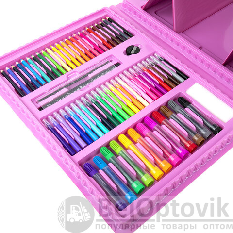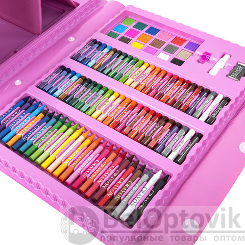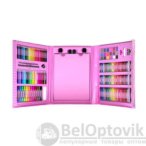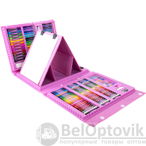 Набор представляет собой кейс с красочным дизайном и грамотно подобранным наполнением из 208 предметов. Кейс раскладывается на 3 части. Каждый предмет надежно закреплен в ячейке. Корпус кейса выполнен из пластика, он легкий и эргономичный, что позволяет брать его с собой куда угодно. Набор надежно упакован в воздушно-пузырчатую пленку и короб из гофрокартона.