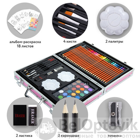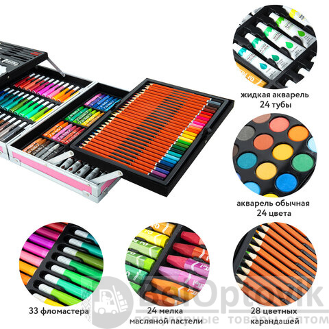 В набор входят: высококачественные цветные карандаши - 28 цветов; яркая масляная пастель - 24 цвета; удобные мини-фломастеры - 33 цвета; насыщенные акварельные краски - 24 цвета; жидкие акварельные краски в тубе - 24 цвета; чернографитные карандаши -2 штуки; кисти из синтетики разной формы и размера - 4 штуки; палитры - 2 штуки; альбом с раскрасками - 18 листов; ластики - 2 штуки; точилка - 1 штука; алюминиевый раскладывающийся кейс с красочным дизайном.