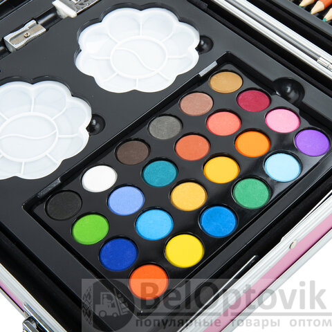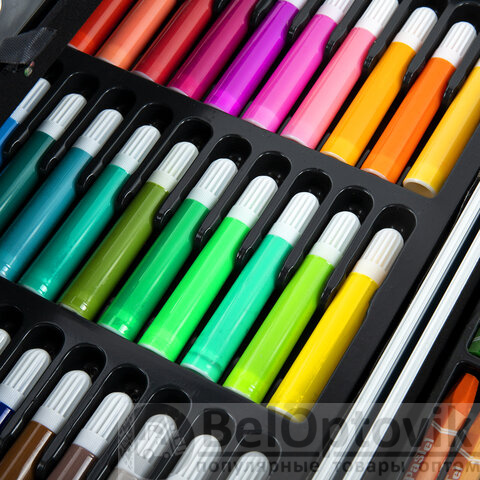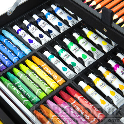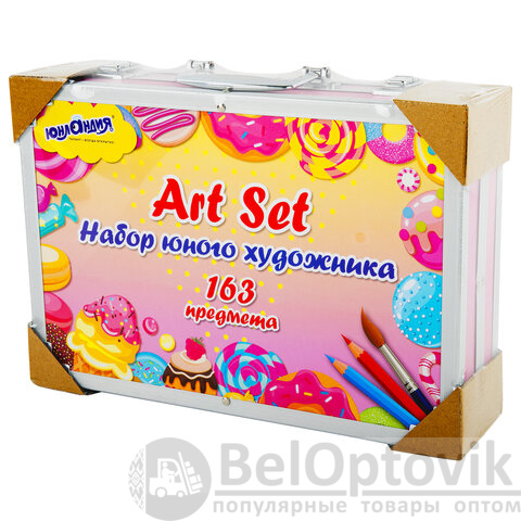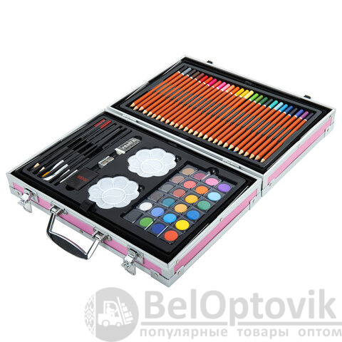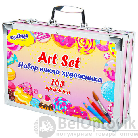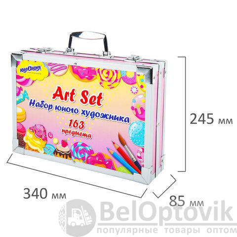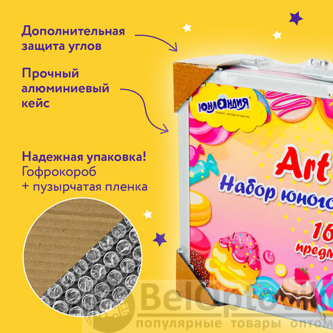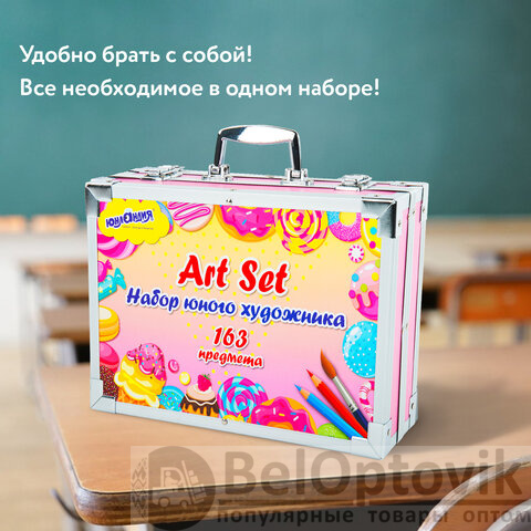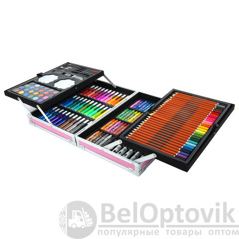 Набор представляет собой кейс с красочным дизайном и грамотно подобранным наполнением из 163 предметов. Кейс раскладывается как книга и имеет два яруса с подъемным механизмом. Каждый предмет надежно закреплен в ячейке. Прочный алюминиевый корпус кейса гарантирует полную защиту внутреннего наполнения от повреждений. Набор надежно упакован в термоусадку, воздушно-пузырчатую пленку и короб из гофрокартона. Углы кейса дополнительно защищены от повреждений при транспортировке. Набор удобно брать с собой в школу или в любые поездки.