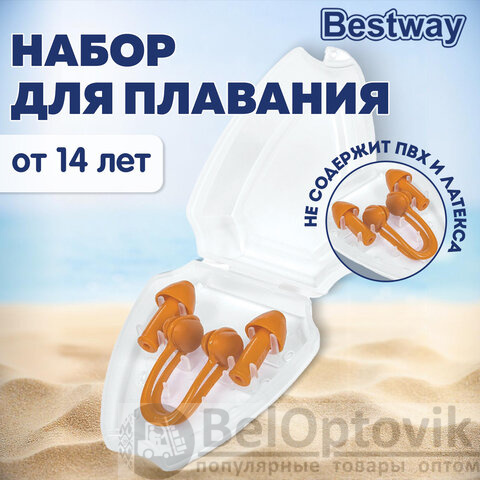 Набор для плавания BESTWAY включает в себя зажим для носа и беруши. Предназначен для детей от 7 лет и подростков, которые занимаются плаванием. Обеспечивает надежную защиту и комфорт при контакте с водой.