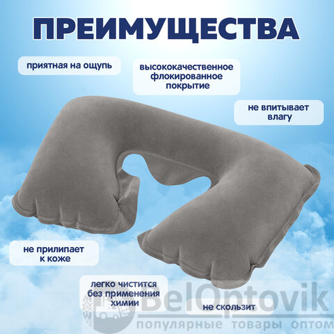 Подушка флокирована, приятная на ощупь, не скользит, не прилипает к коже, не впитывает влагу, легко чистится без применения химии. Надувная подушка разработана таким образом, что делает отдых максимально комфортным, и особенно пригодится людям, которые вынуждены проводить много времени в дороге.