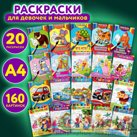 Раскраски "ДЛЯ ДЕВОЧЕК И МАЛЬЧИКОВ", КОМПЛЕКТ 20 шт., А4, 195х275 мм, 8 стр., ПП
