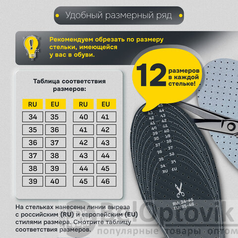 Стельки для обуви с российским размером RU 34-45, что соответствует европейскому размеру EU 35-46. На стельках указаны оба стандарта размера: RU и EU, а также нанесены линии выреза. Для удобства на упаковке приведена таблица соответствия размеров RU/EU.