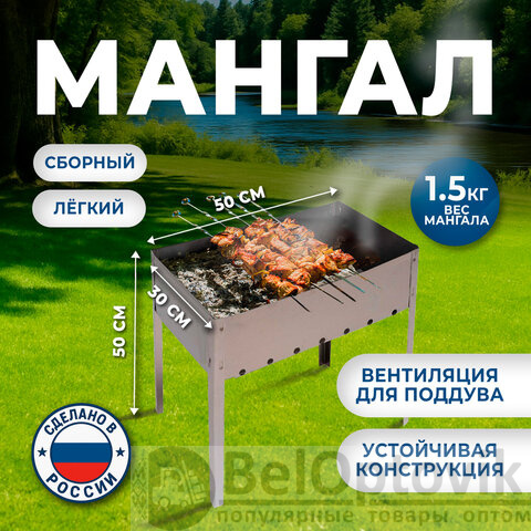 Мангал сборный из стали. Практичен в использовании: удобные длинные ножки создают комфортные условия для приготовления блюд. Компактные габариты 500х300х500 мм позволяют легко переносить мангал и быстро подготавливать его к использованию.