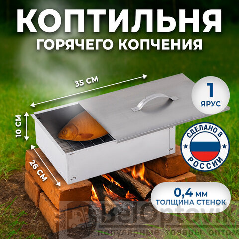 Модель размером 350х260х100 мм оснащена одним ярусом и решёткой, что позволяет быстро приготовить ароматные копчёности для семейного ужина или небольшой компании. Герметичная крышка с ручкой удерживает тепло и дым, обеспечивая равномерное копчение. Корпус из металла устойчив к деформации и выдерживает высокие температуры.