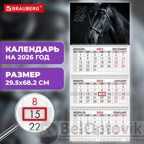 Календарь квартальный на 2026 г., 3 блока, 3 гребня, бегунок, мелованная бумага, BRAUBERG, "Символ года", 116790