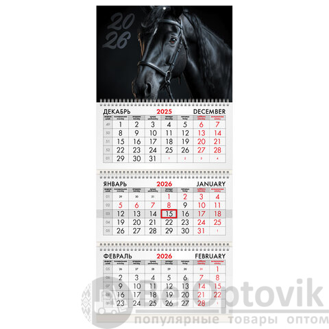 Офисный календарь на 2026 год на 3 гребнях. Для удобства планирования состоит из 3 блоков с календарными сетками на три месяца – предыдущий, текущий и следующий.