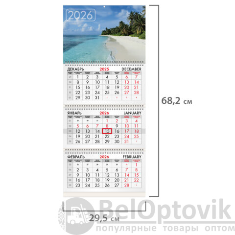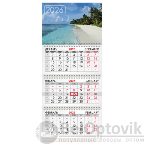 Офисный календарь на 2026 год на 3 гребнях. Для удобства планирования состоит из 3 блоков с календарными сетками на три месяца – предыдущий, текущий и следующий.