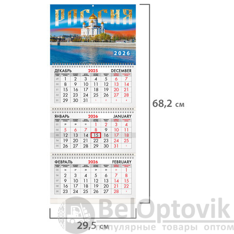 Офисный календарь на 2026 год на 3 гребнях. Для удобства планирования состоит из 3 блоков с календарными сетками на три месяца – предыдущий, текущий и следующий.