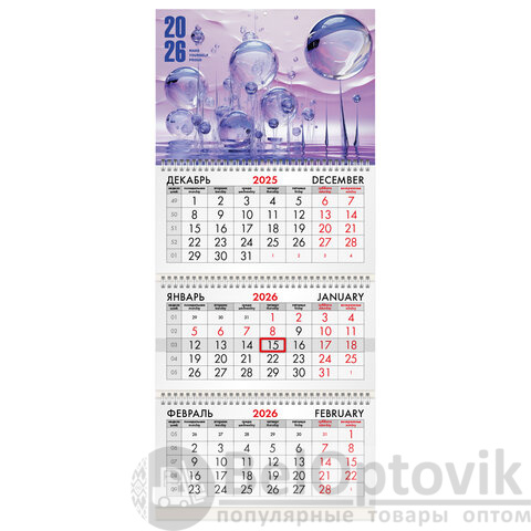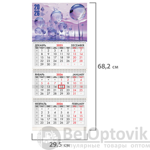 Офисный календарь на 2026 год на 3 гребнях. Для удобства планирования состоит из 3 блоков с календарными сетками на три месяца – предыдущий, текущий и следующий.