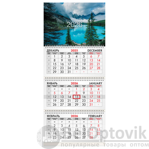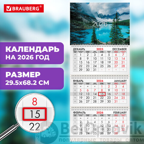 Календарь квартальный на 2026 г., 3 блока, 3 гребня, бегунок, мелованная бумага, BRAUBERG, "Горное озеро", 116801