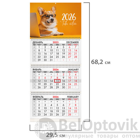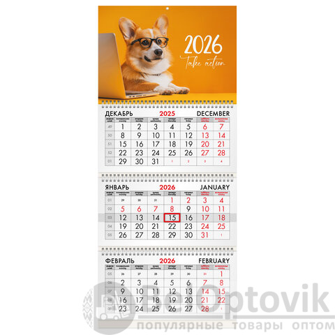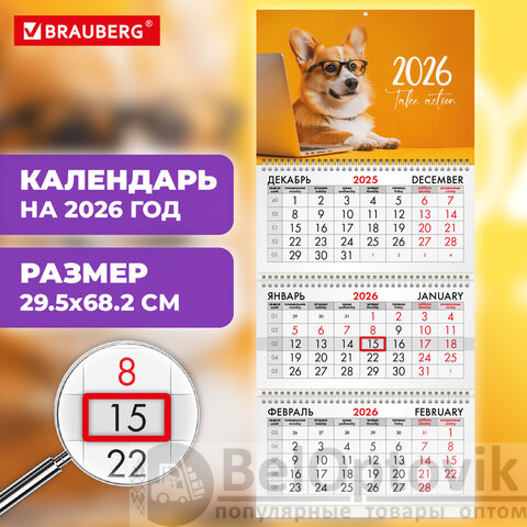Календарь квартальный на 2026 г., 3 блока, 3 гребня, бегунок, мелованная бумага, BRAUBERG, "Умный корги", 116803