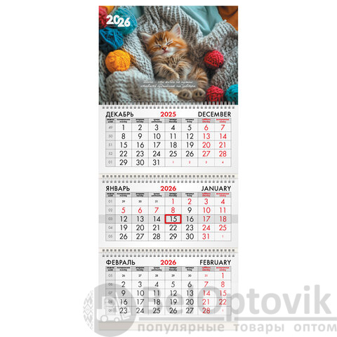 Календарь квартальный на 2026 г., 3 блока, 3 гребня, бегунок, мелованная бумага, BRAUBERG, "Котенок", 116805