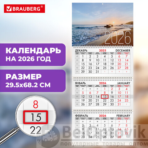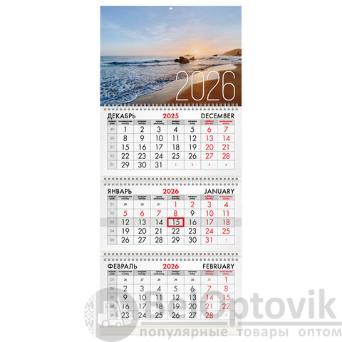Календарь квартальный на 2026 г., 3 блока, 3 гребня, бегунок, мелованная бумага, BRAUBERG, "Морской пейзаж", 116807