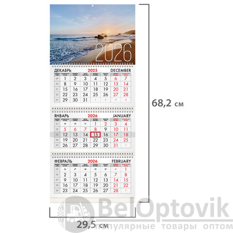 Офисный календарь на 2026 год на 3 гребнях. Для удобства планирования состоит из 3 блоков с календарными сетками на три месяца – предыдущий, текущий и следующий.