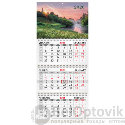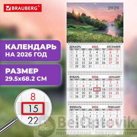 Календарь квартальный на 2026 г., 3 блока, 3 гребня, бегунок, мелованная бумага, BRAUBERG, "Душа России", 116809