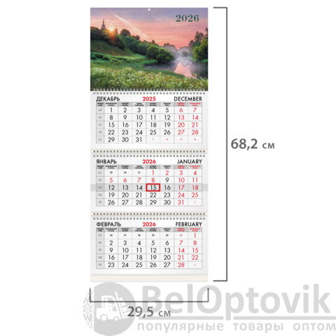 Офисный календарь на 2026 год на 3 гребнях. Для удобства планирования состоит из 3 блоков с календарными сетками на три месяца – предыдущий, текущий и следующий.