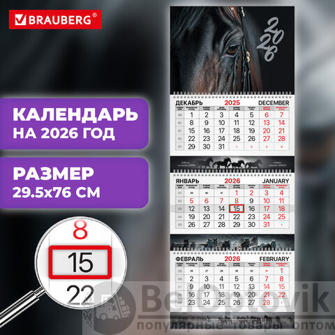 Календарь квартальный 2026 г., 3 блока, 3 гребня, бегунок, мелованная бумага, BRAUBERG EXTRA, "Символ года", 116812