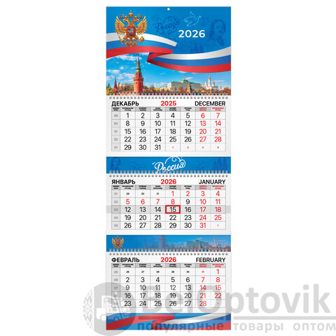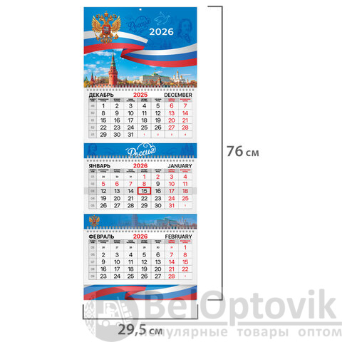 Офисный календарь на 2026 год на 3 гребнях. Для удобства планирования состоит из 3 блоков с календарными сетками на три месяца – предыдущий, текущий и следующий. Курсор-бегунок выделяет текущую дату.