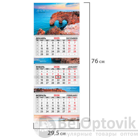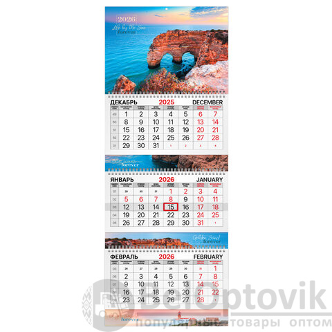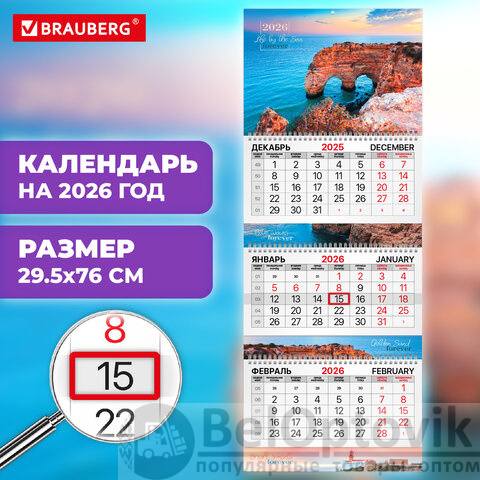 Календарь квартальный на 2026 г., 3 блока, 3 гребня, бегунок, мелованная бумага, BRAUBERG EXTRA, "Южный берег", 116817