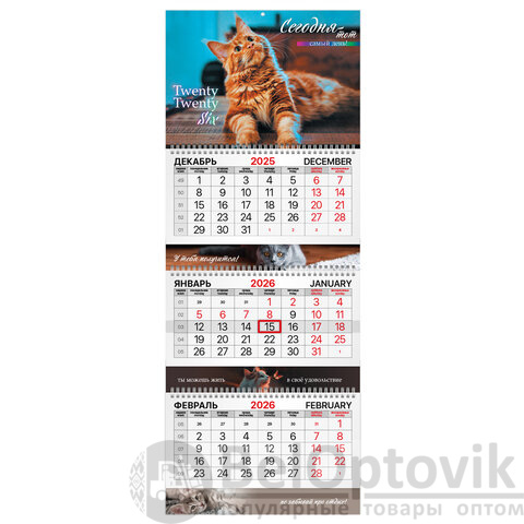 Календарь квартальный 2026 г., 3 блока, 3 гребня, бегунок, мелованная бумага, BRAUBERG EXTRA, "Котик", 116824