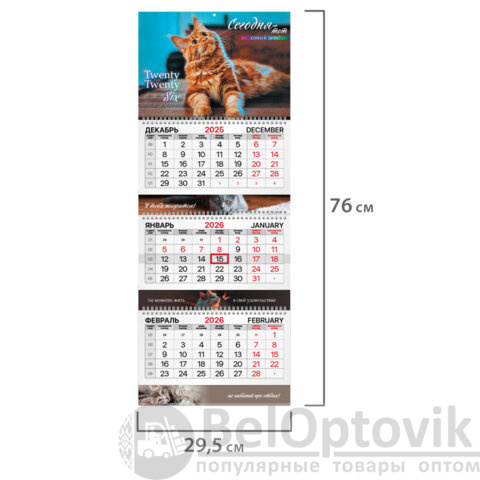 Офисный календарь на 2026 год на 3 гребнях. Для удобства планирования состоит из 3 блоков с календарными сетками на три месяца – предыдущий, текущий и следующий. Курсор-бегунок выделяет текущую дату.