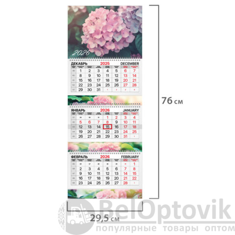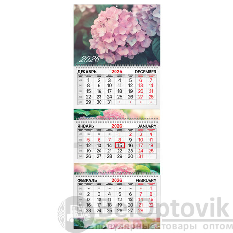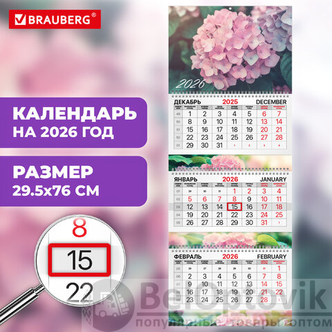 Календарь квартальный 2026 г., 3 блока, 3 гребня, бегунок, мелованная бумага, BRAUBERG EXTRA, "Гортензия", 116826