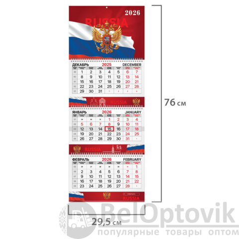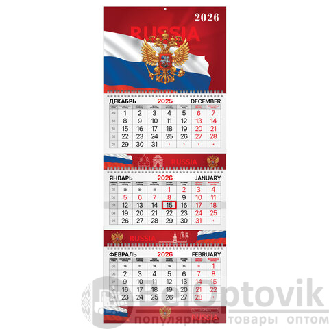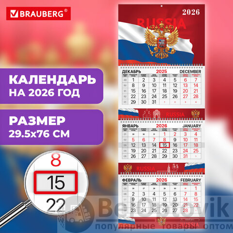 Календарь квартальный 2026 г., 3 блока, 3 гребня, бегунок, мелованная бумага, BRAUBERG EXTRA, "Символика РФ", 116827