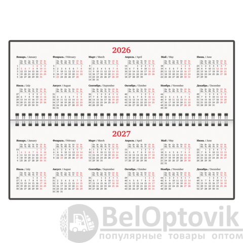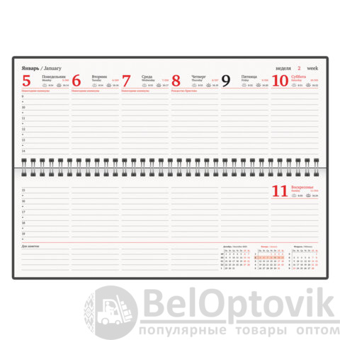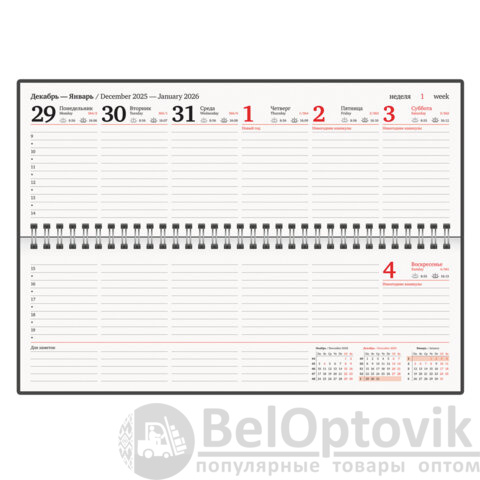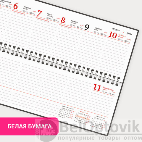 Внутренний блок содержит 60 листов офсетной бумаги белого цвета плотностью 70 г/м2. Обложка из балакрона и твердый переплет обеспечивают долгий срок службы. Для заметок в планинге имеется 11 страниц в конце внутреннего блока. Подходит для тиснения только фольгой. Скрепление осуществляется с помощью евроспирали. Размер изделия – 305х140 мм.