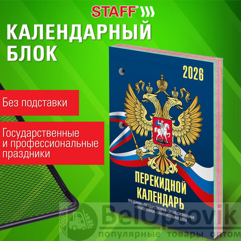 Блок календаря на 2026 год напечатан на офсетной бумаге плотностью 60 г/м2 в четыре краски с выделением цветом выходных и праздничных дней. Справочная информация на 160 листах: календарь на текущий месяц, часы восхода и захода солнца, долгота дня, лунный календарь, праздники.