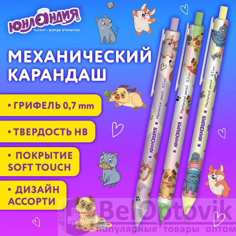 Карандаш механический 0,7 мм с принтом, ЮНЛАНДИЯ "CUTE PETS", корпус soft-touch ассорти, 182061