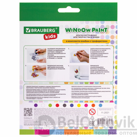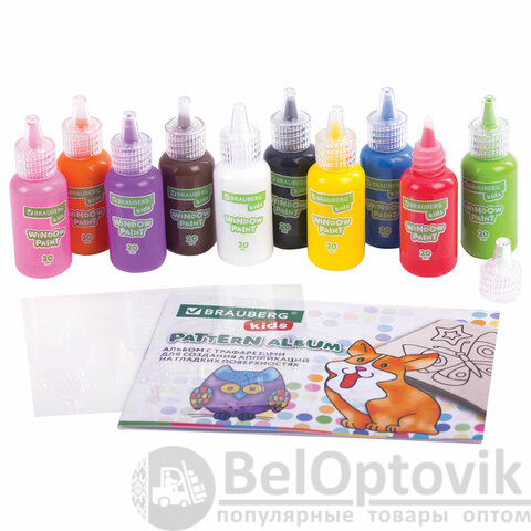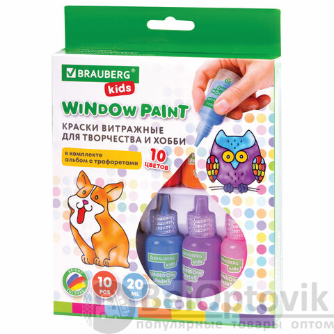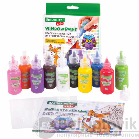 В набор витражных красок BRAUBERG KIDS входят 10 ярких непрозрачных красок (красный, синий, зеленый, желтый, черный, оранжевый) в тубах по 20 мл, книга с шаблонами для рисования и пленка для предварительного создания аппликаций из красок. Готовые самоклеящиеся аппликации можно многократно переносить на любые гладкие поверхности.