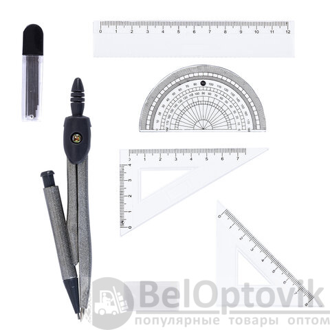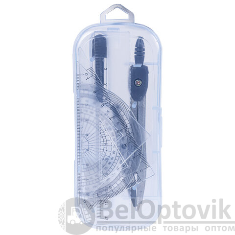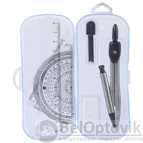 - Комплектация: линейка, пенал пластиковый, пенал с запасным грифелем, стирательная резинка, транспортир, треугольник 30°60°, треугольник 45°, циркуль