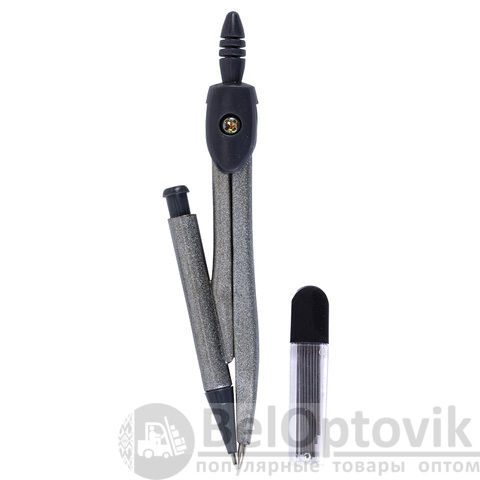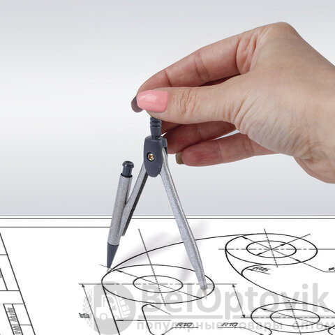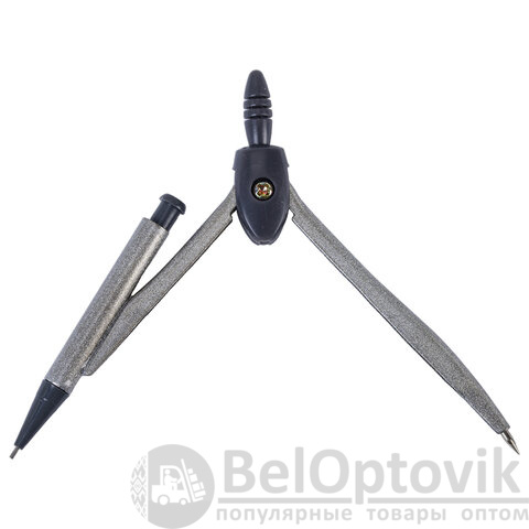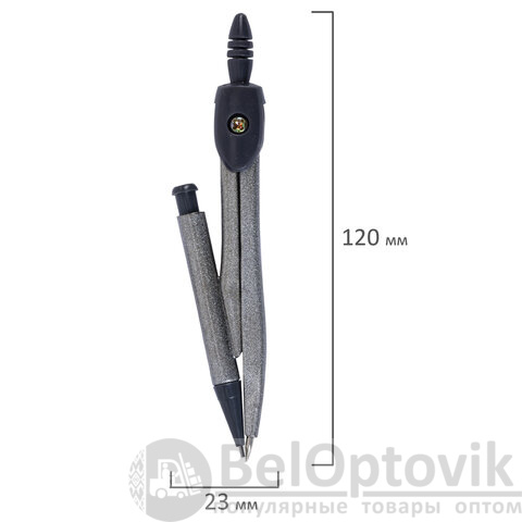 Циркуль длиной 120 мм с механическим карандашом имеет несгибаемые штанги. Изготовлен из металла темно-серого цвета, пластиковые элементы черного цвета.