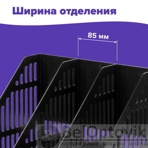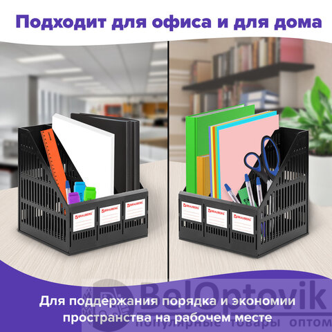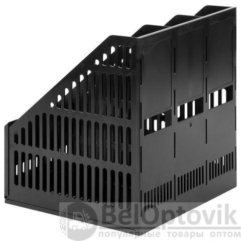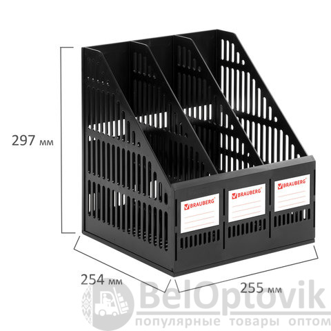 Выполнен в черном цвете с тремя отделениями и с табличками для маркировки. Предназначен для хранения бумаг формата А4. Представляет собой устойчивую разборную конструкцию с сетчатыми поверхностями. Поставляется в разобранном виде. Размеры: высота - 297 мм, ширина - 255 мм, глубина - 254 мм.