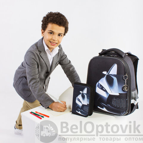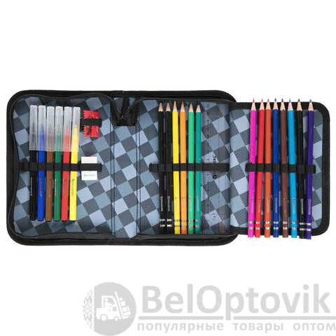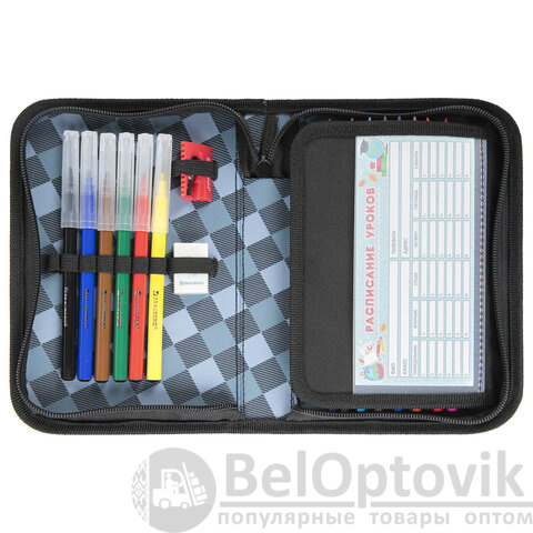 Пенал оснащен 1 основным отделением с одной откидной планкой. Внутри 24 предмета, необходимых для учебы:
