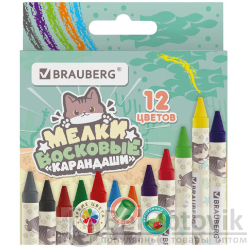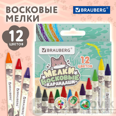 Восковые мелки BRAUBERG "МИЛЫЕ КОТЫ", НАБОР 12 цветов, 273229