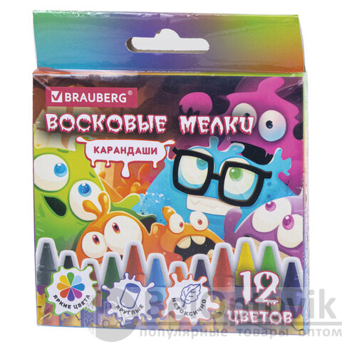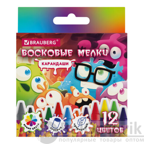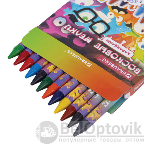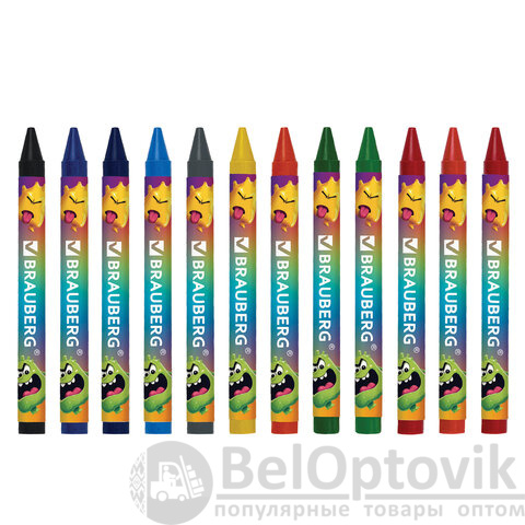 Восковые мелки BRAUBERG "CUTE MONSTERS", 12 цветов, 273238
