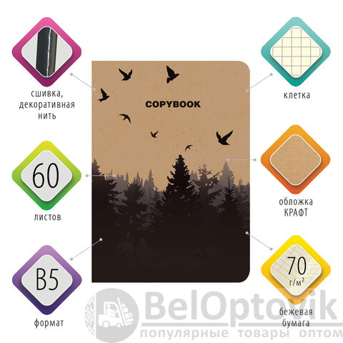 Общая тетрадь формата В5 содержит 60 листов с линовкой в клетку. Сшивка плотно соединяет листы. Обложка изготовлена из высококачественного импортного крафт-картона с двусторонней запечаткой, что придает тетради изысканный и неповторимый стиль. Внутренний блок - тонированная офсетная бумага цвета слоновой кости плотностью 70 г/м2.