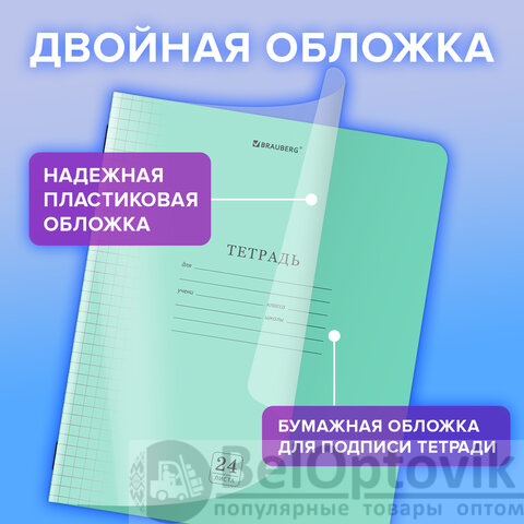 Тетрадь с двойной обложкой: внешняя выполнена из высококачественного износостойкого прозрачного пластика, внутренняя — из качественной мелованной бумаги 110 г/м2. Преимущество таких тетрадей заключается в том, что для сохранения внешнего вида не нужно покупать дополнительную обложку. Внутренний блок плотностью 60 г/м2 из офсетной бумаги содержит 24 листа в клетку с полями. Скрепка надежно скрепляет листы между собой. Справочная информация на задней стороне обложки содержит меры длины, объема, массы, площади и таблицу умножения.
