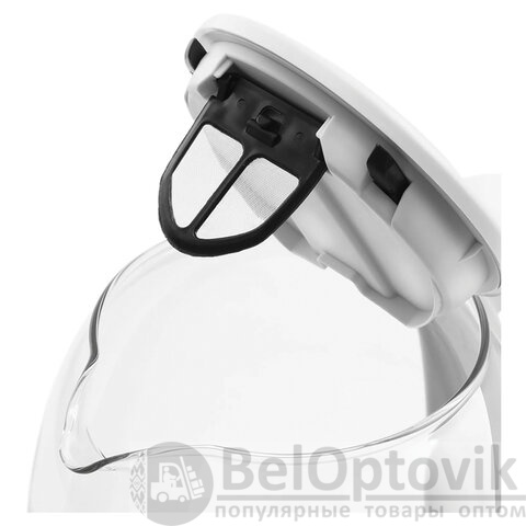 Корпус выполнен из экологически чистого термостойкого стекла. Большой диаметр горлышка облегчает доступ внутрь при мытье. Съёмный фильтр-сетка защищает от накипи.