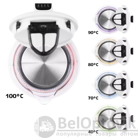 При включении чайника по периметру дна загорается подсветка, которая является индикатором работы и одновременно подсвечивает воду разными цветами в зависимости от температурного режима.