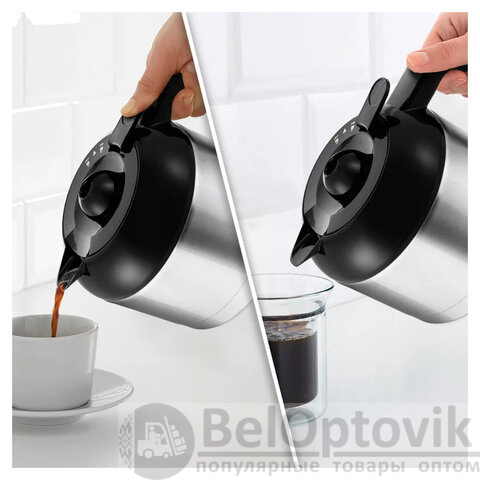 Кофеварка имеет объём 1,25 л, что позволяет приготовить до 10 чашек за раз – идеально для семьи или команды на работе. Благодаря режиму автозапуска вы можете заранее установить время приготовления, и кофеварка включится сама – вы проснётесь под аромат свежесваренного кофе. Нагревательная пластина отсутствует: вместо этого используется термос-кофейник с термоизолированными стенками – температуру напитка сохраняется до двух часов. Чтобы налить кофе, достаточно нажать на ручку – она открывает клапан, закрытый в обычном положении для сохранения тепла.