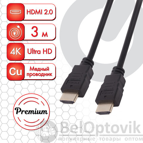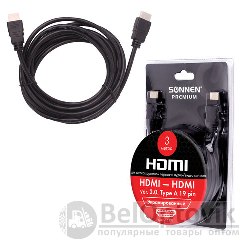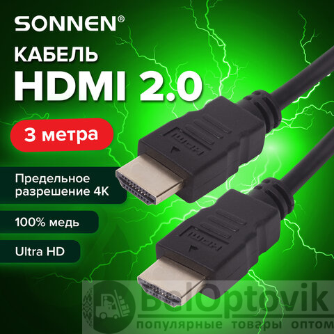 Кабель HDMI AM-AM, 3 м, SONNEN Premium, ver 2.0, FullHD, 4К, UltraHD, для ноутбука, компьютера, монитора, телевизора, проектора, 513131
