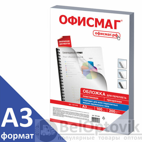 Обложки пластиковые для переплета БОЛЬШОЙ ФОРМАТ А3, КОМПЛЕКТ 100 шт., 200 мкм, прозрачные, ОФИСМАГ, 531446