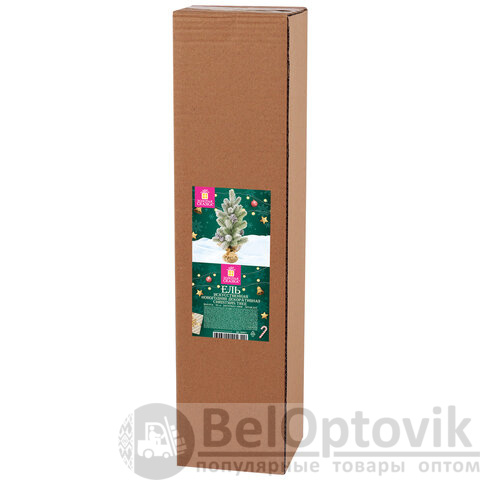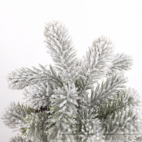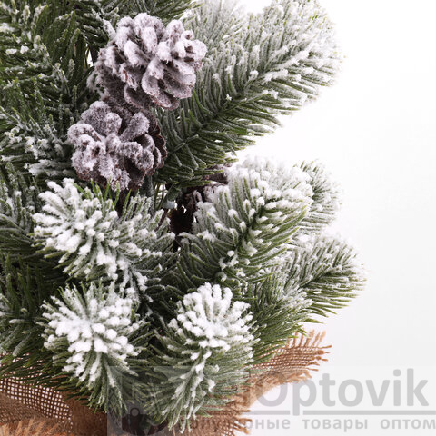 Материал – 100% литой ПЭТ. Цвет хвои – зелёный. Иголки украшены искусственным белым снегом и декоративными сосновыми шишками размером 3x4 см. Материал подставки – застывший цементный раствор, обёрнутый декоративной холщовой тканью.