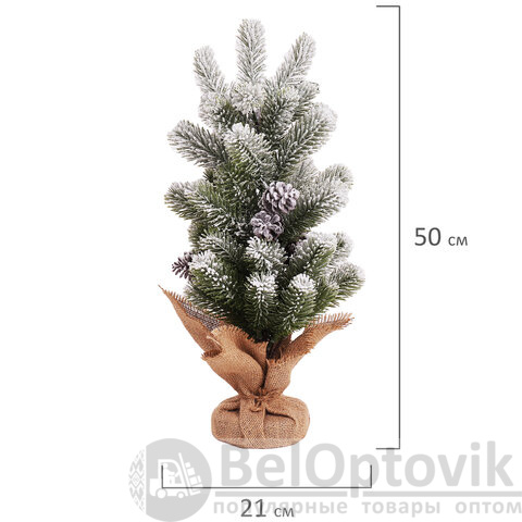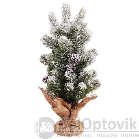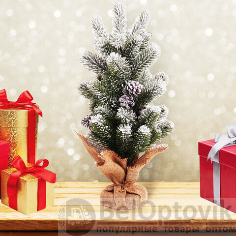 Ель искусственная настольная заснеженная с шишками высотой 50 см представляет собой конструкцию из металлического каркаса и закрепленных к нему ветвей.